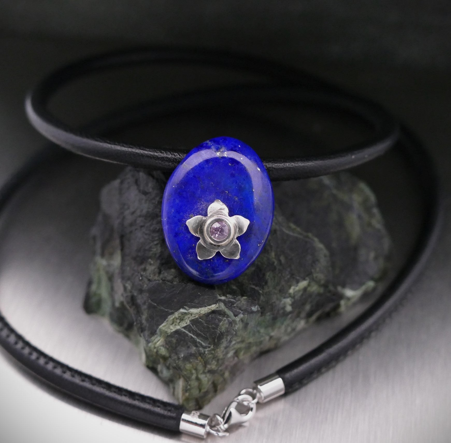 Lederhalskette mit einer Edelsteinblume, personalisierter Schmuck