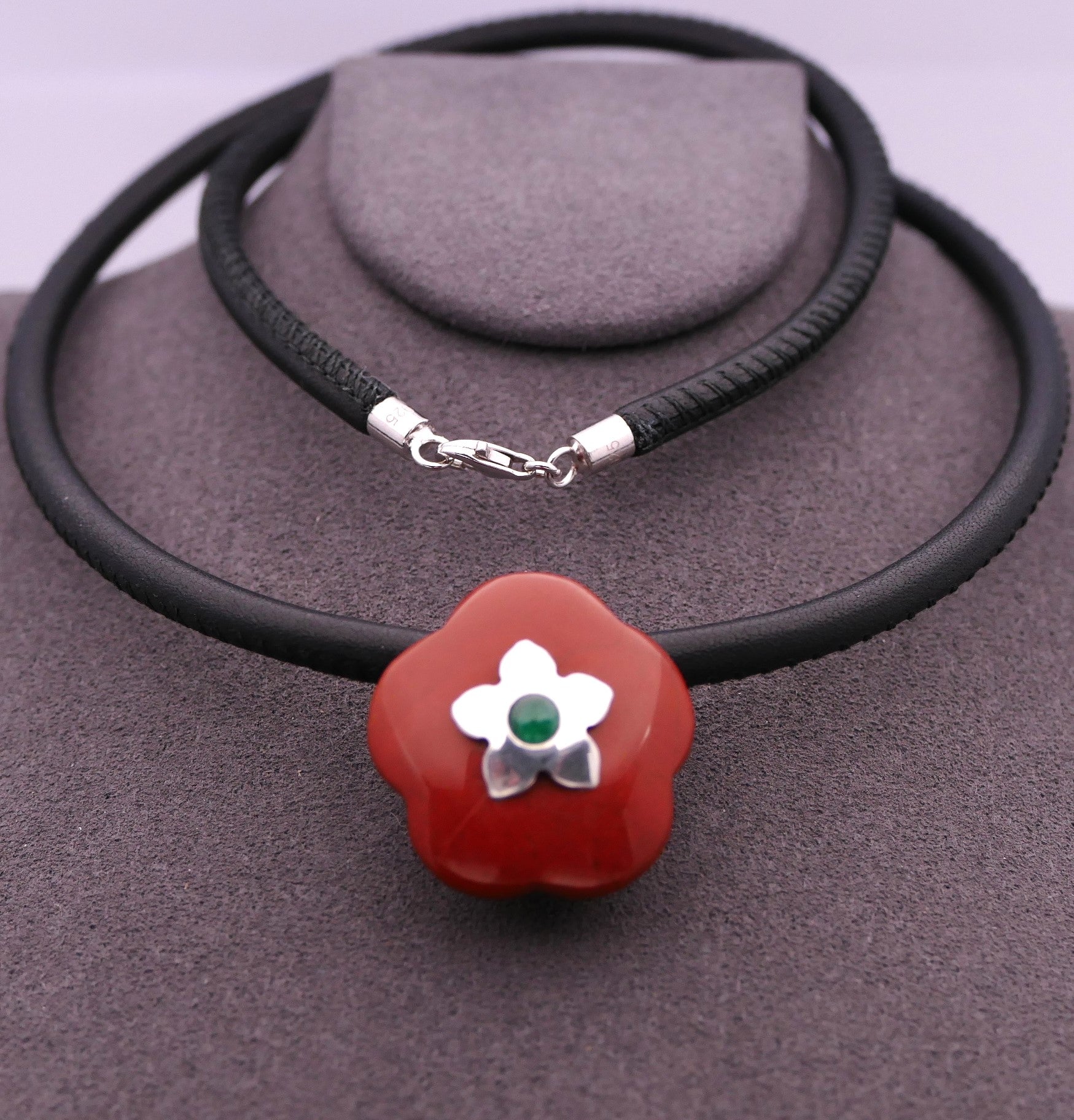 Stone: Red jasper 24 mm in diameter with a small 12 mm diameter flower in 925 silver in the center and a 3 mm emerald.