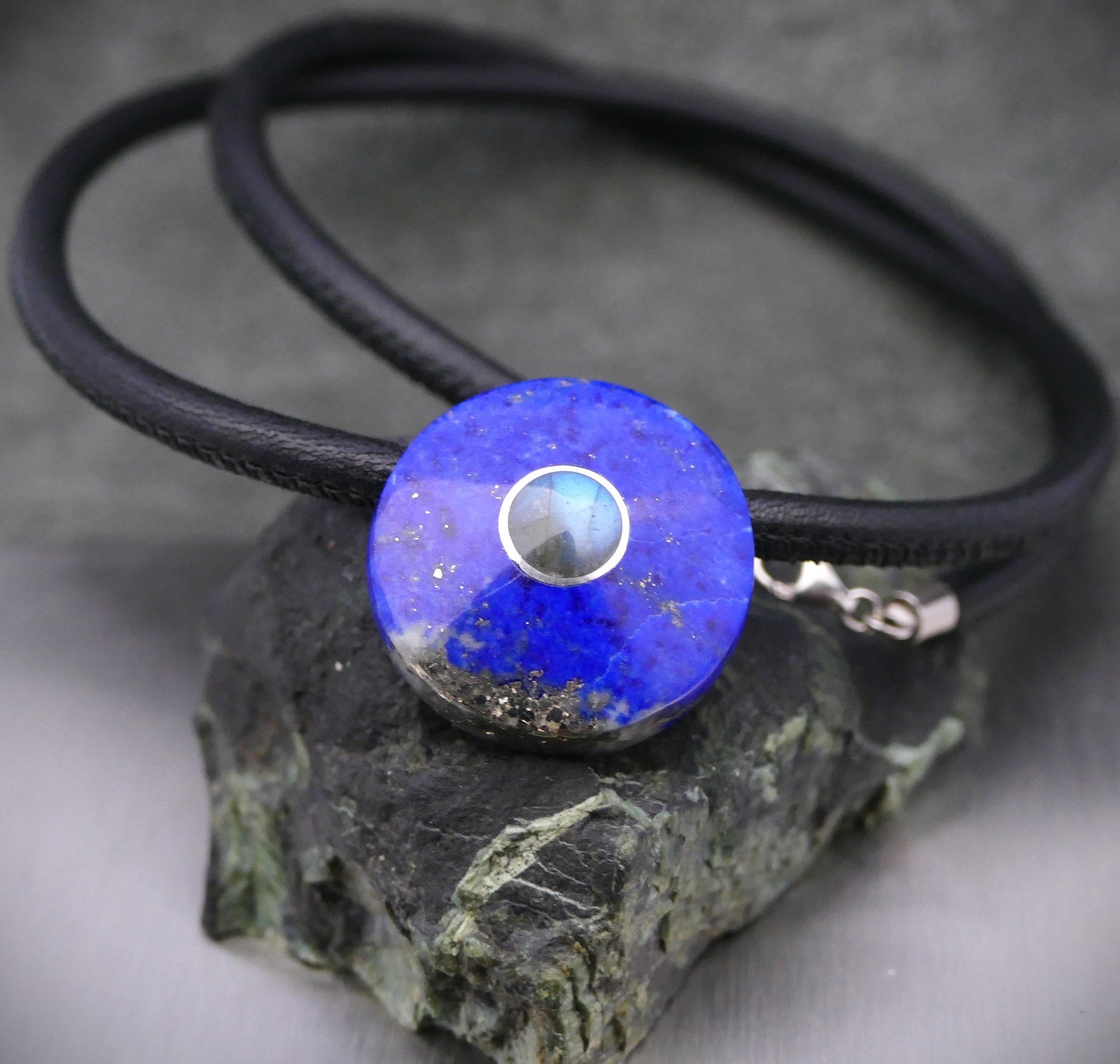 Pierre : lapis-lazuli de 24 mm de diamètre et labradorite de 7 mm, serti au centre d'argent 925.