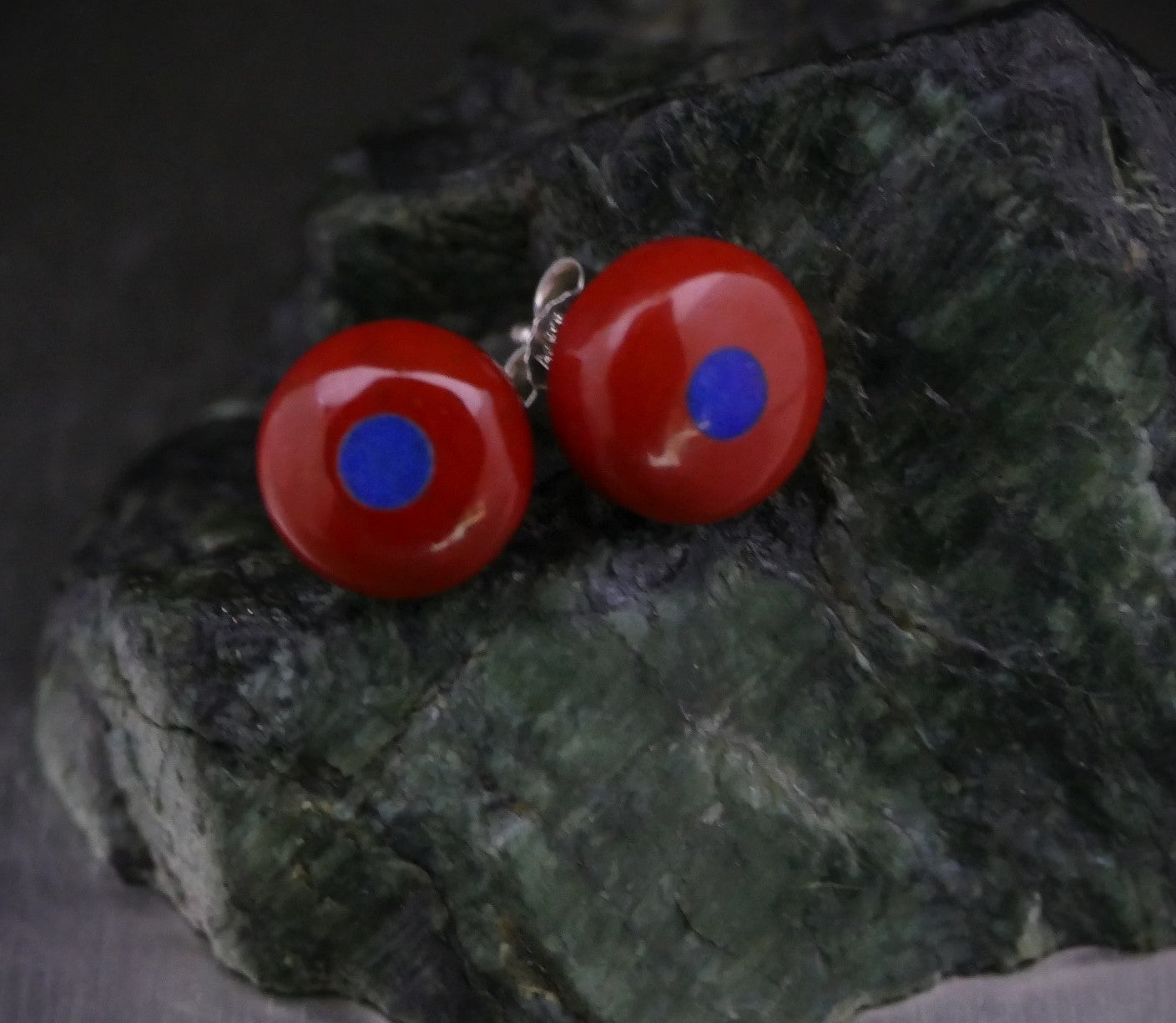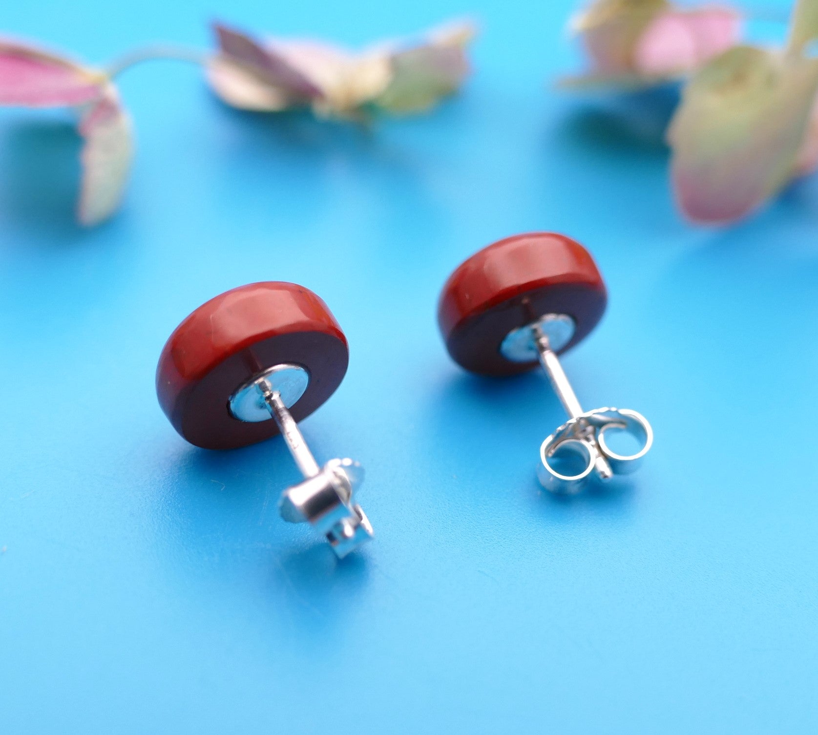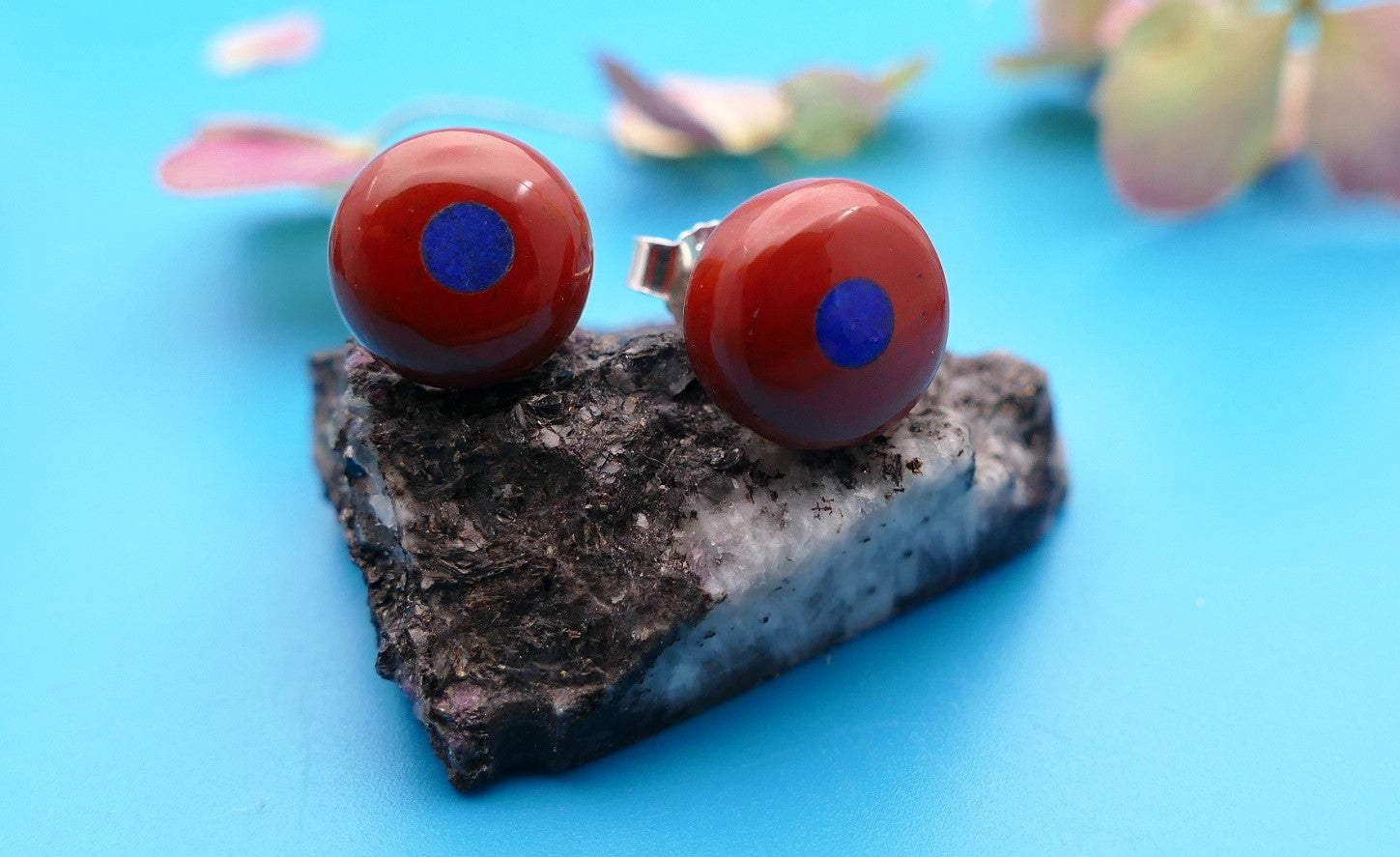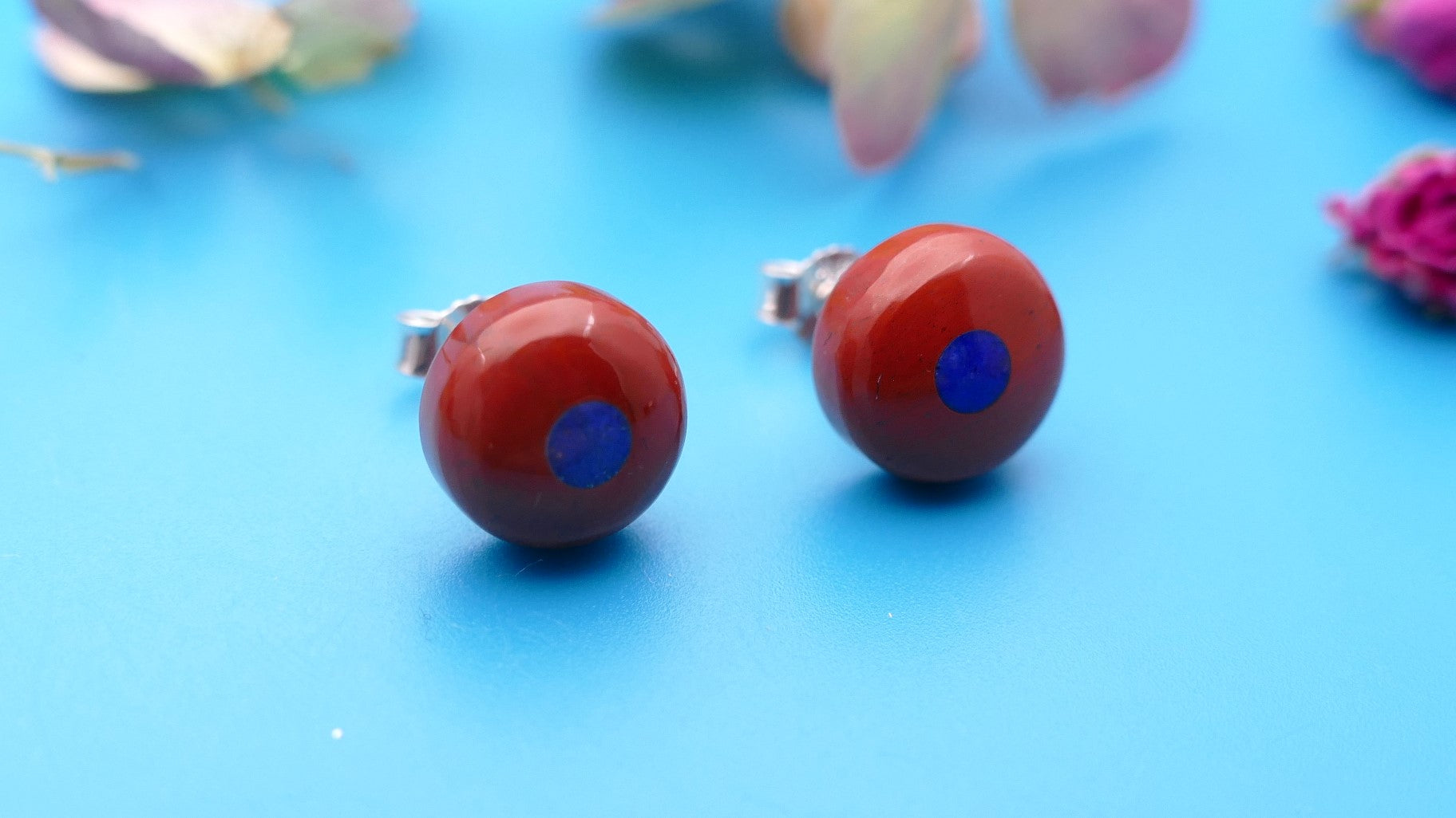 Ohrringe aus 925er Silber, 11 mm roter Jaspis mit 3 mm Lapislazuli in der Mitte.
