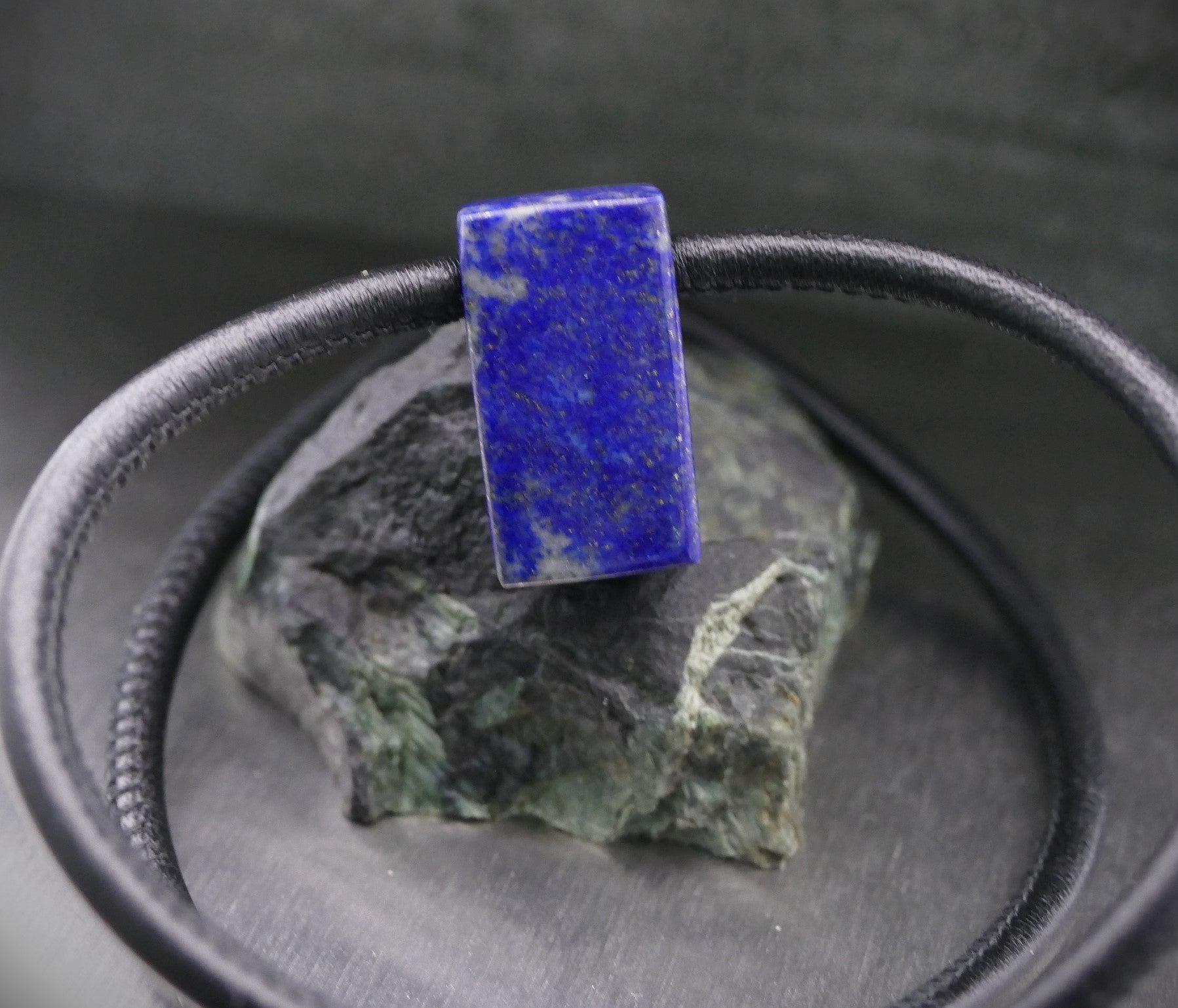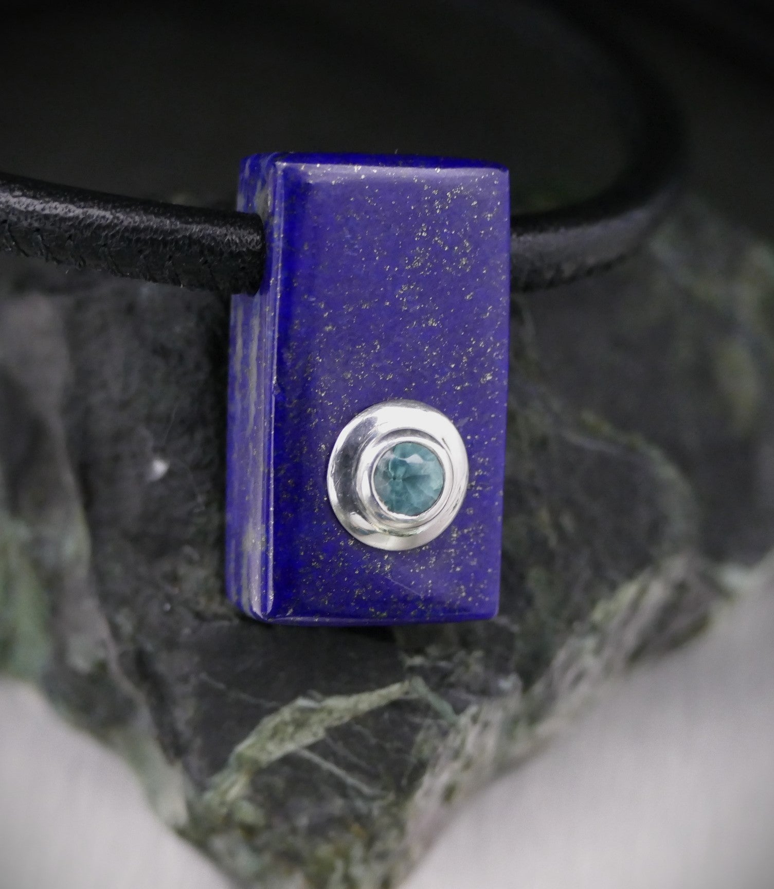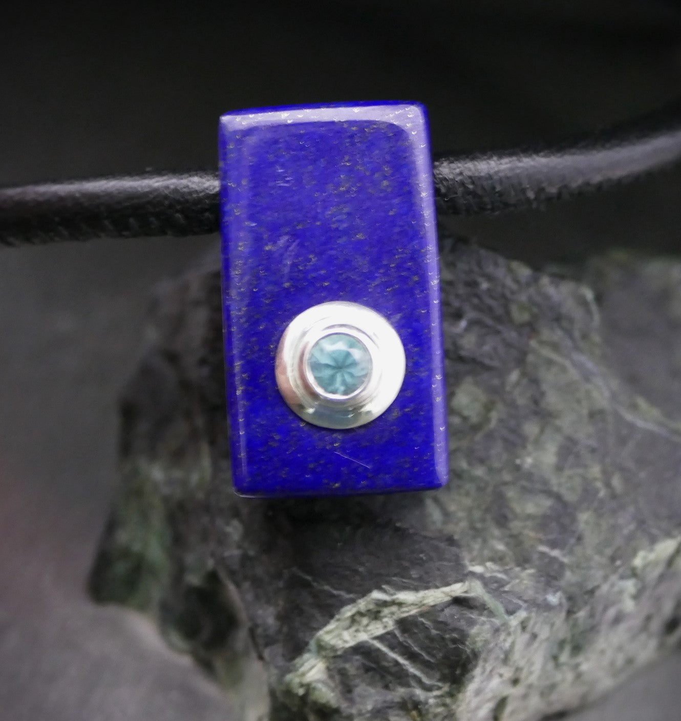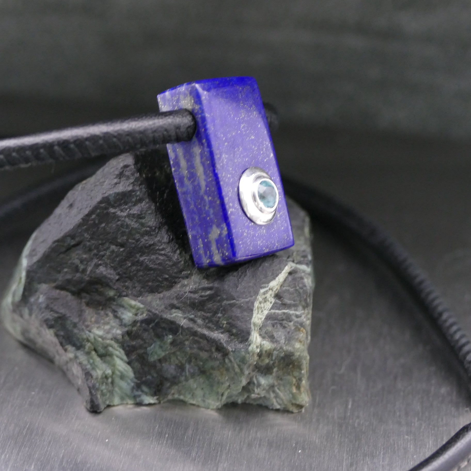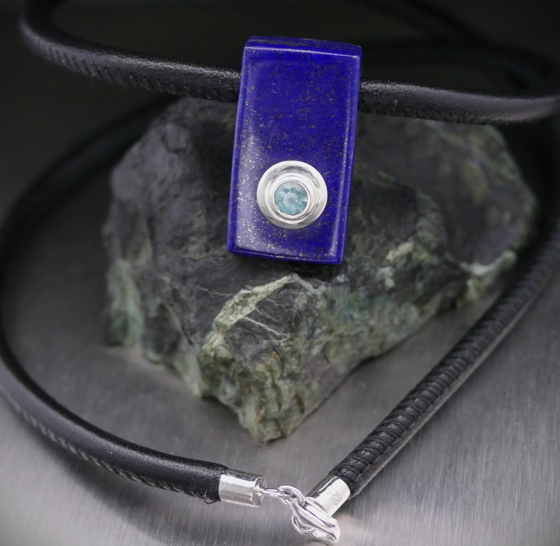 Steine: Lapislazuli (14 x 26 mm) und Grandidierit (4,5 mm), gefasst in 925er Silber.