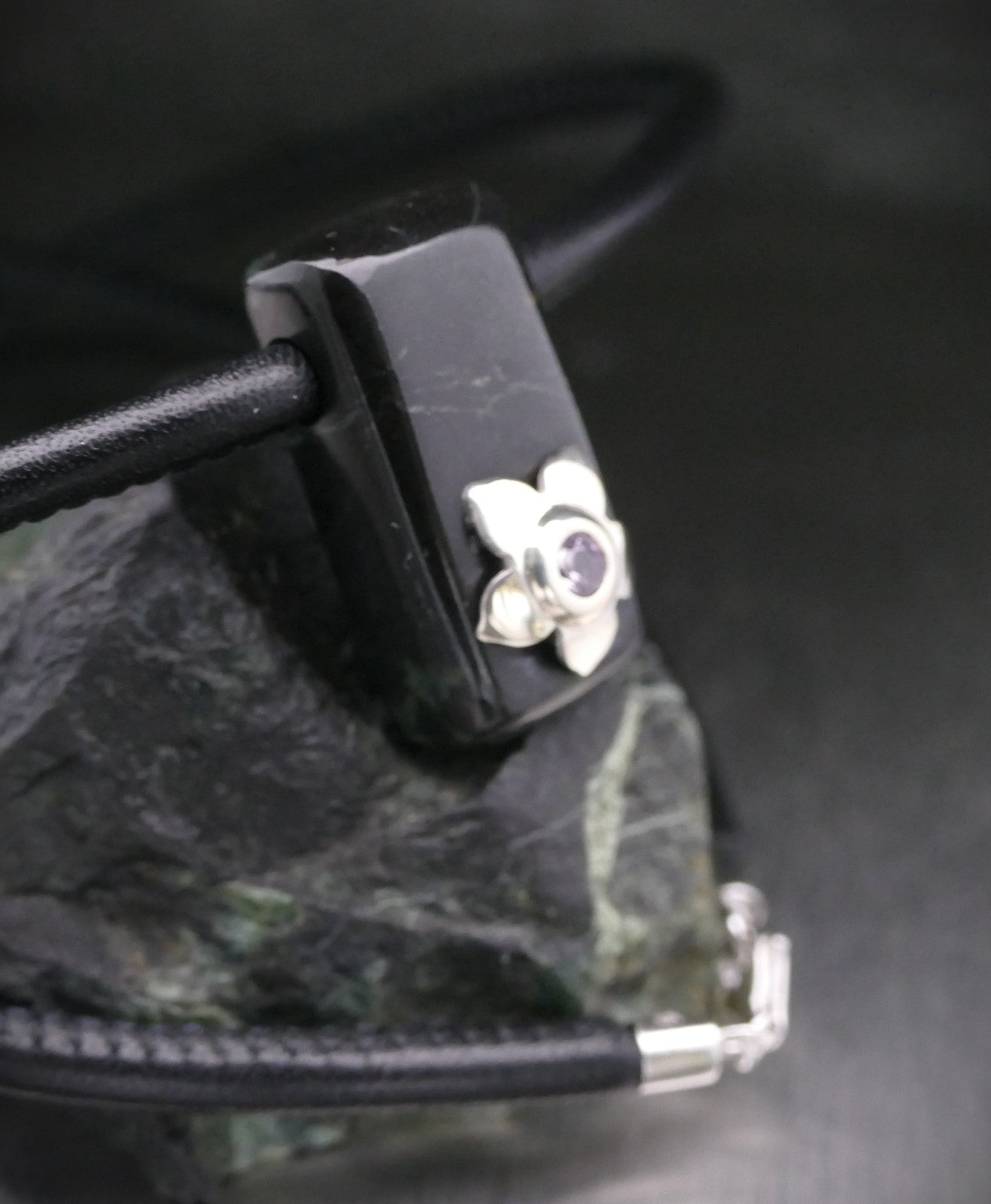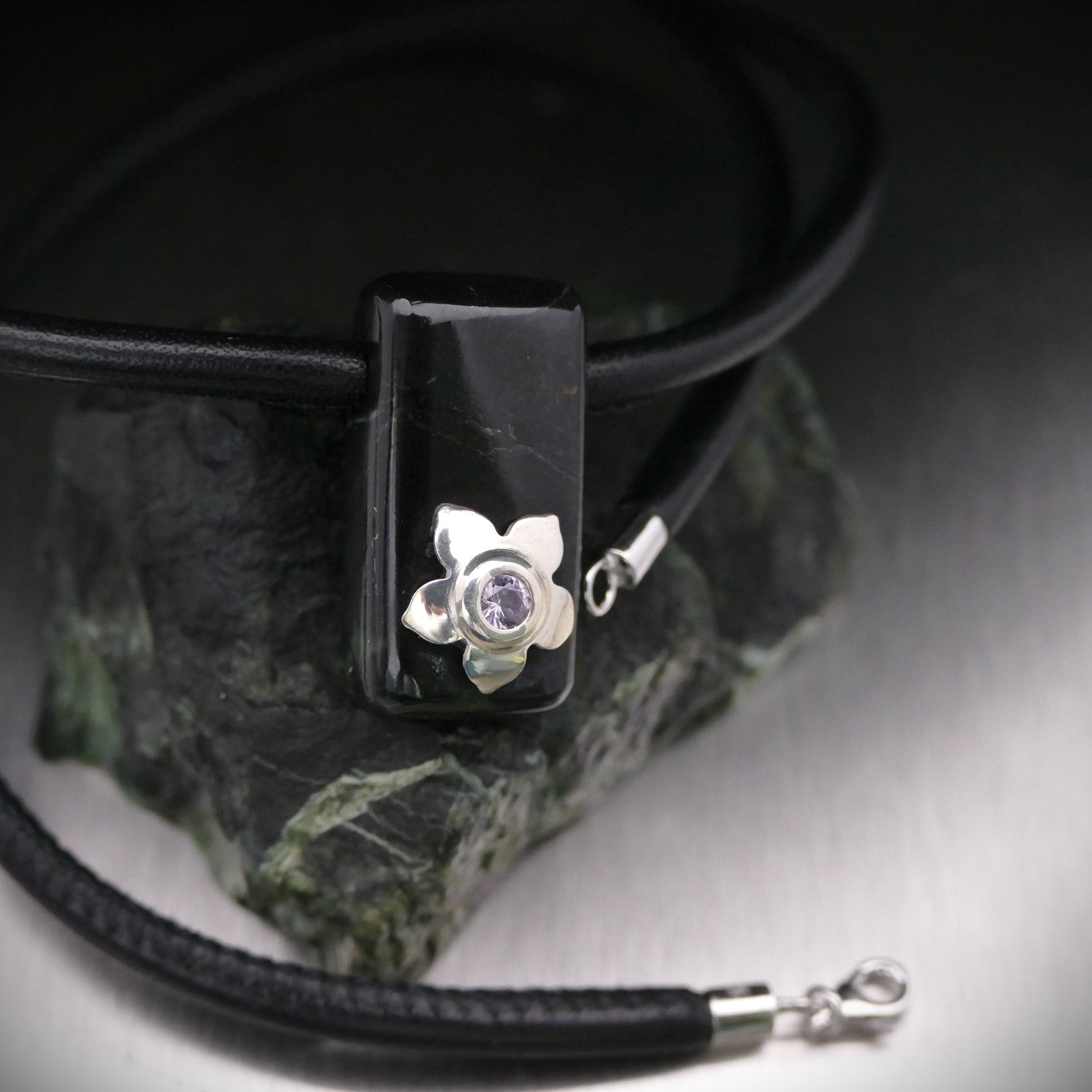 Steine: Korsischer Smaragdit (18 x 24 mm) und rosa Saphir (4 mm), in der Mitte einer Blume aus 925er Silber eingefasst.