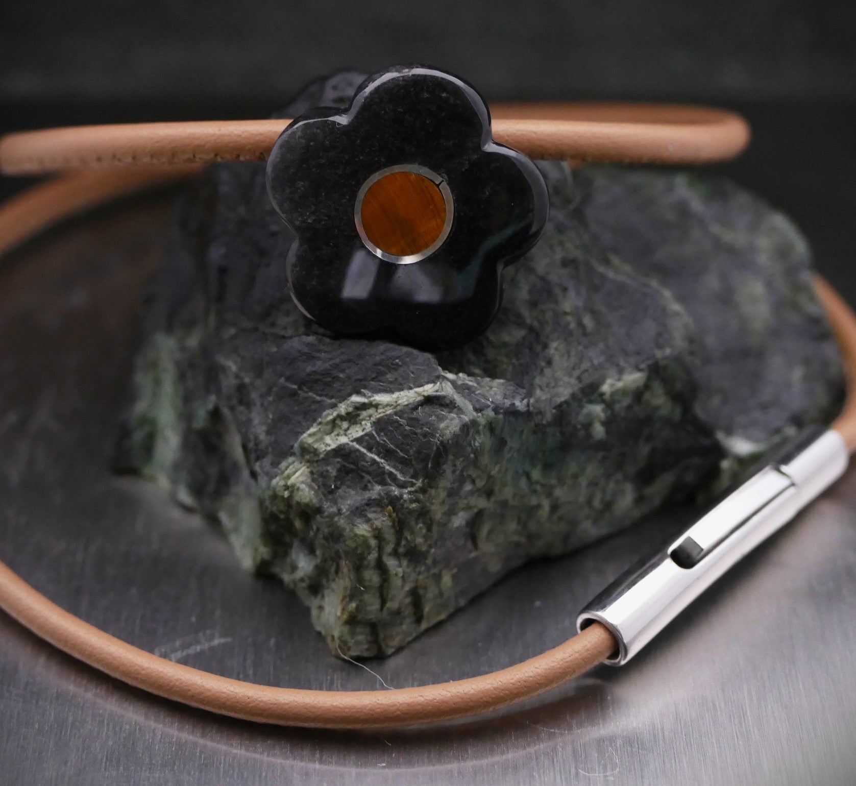 Blüte: 20 mm Obsidian mit 6,5 mm Tigerauge, in der Mitte mit 925er Silber besetzt.