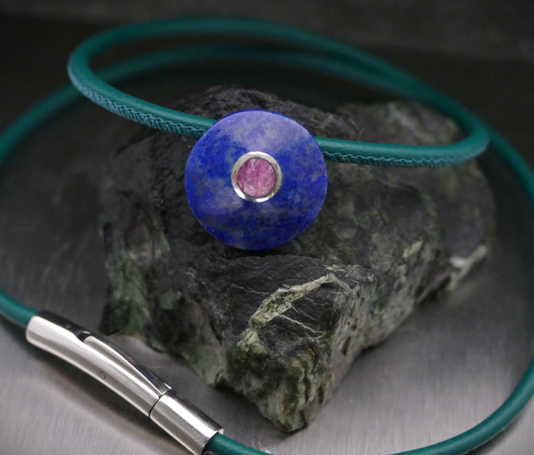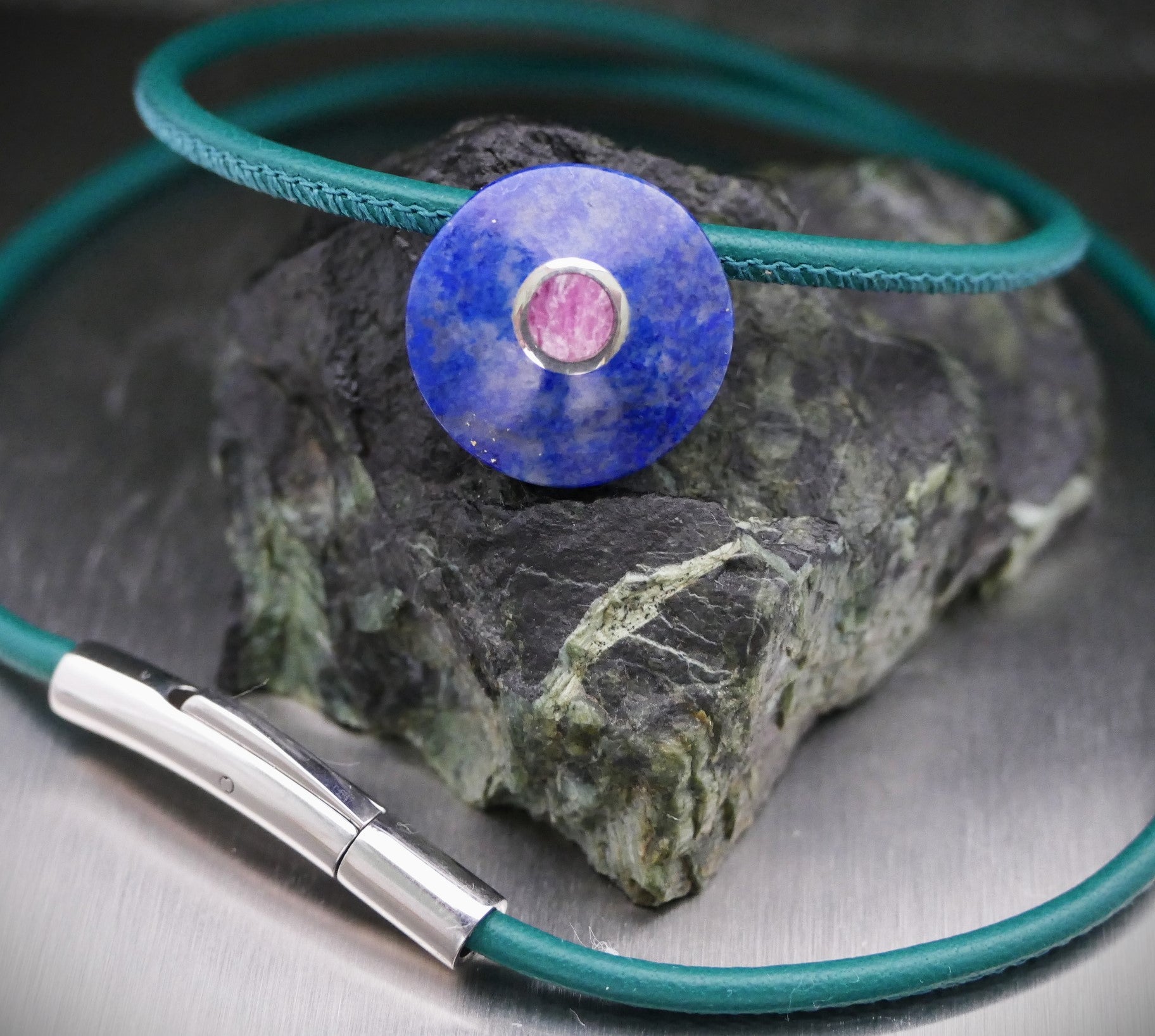 Stein: Lapislazuli 18 mm Durchmesser und Rubin 4,5 mm Durchmesser, in der Mitte mit 925er Silber besetzt.