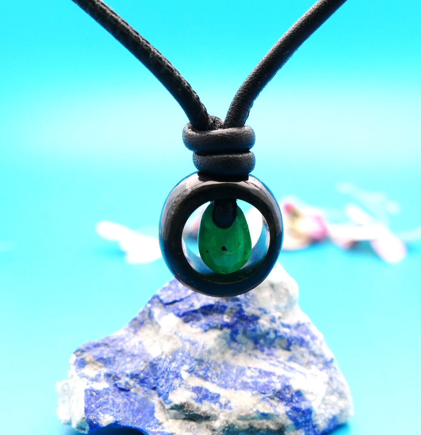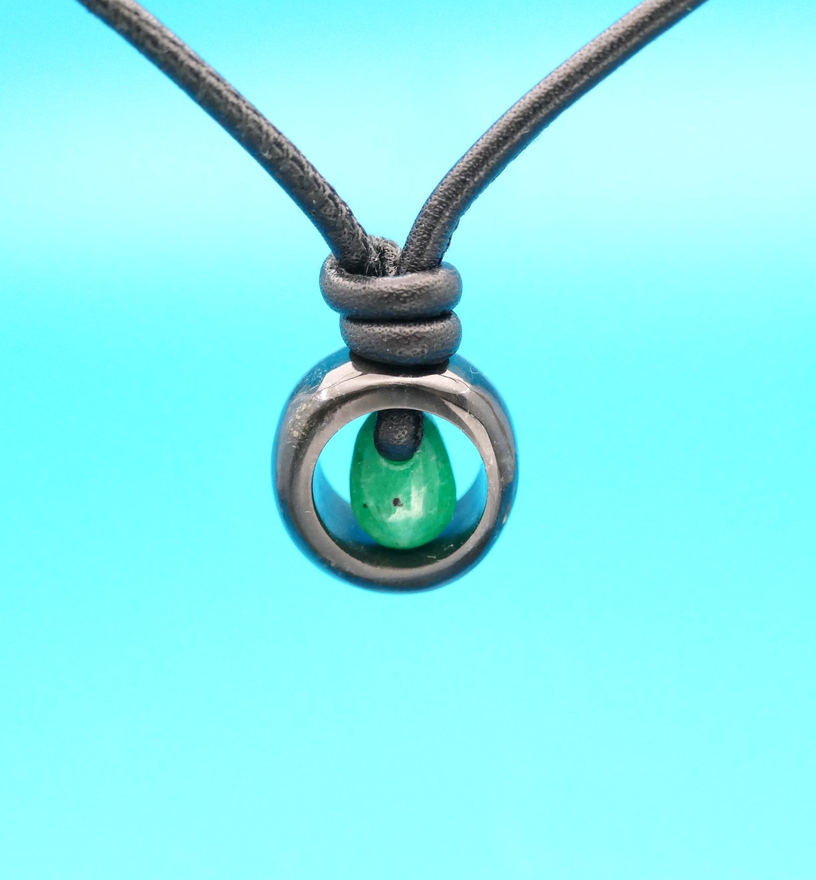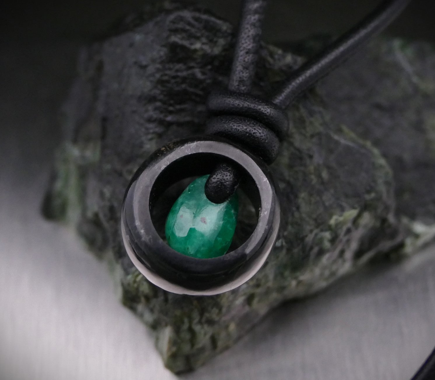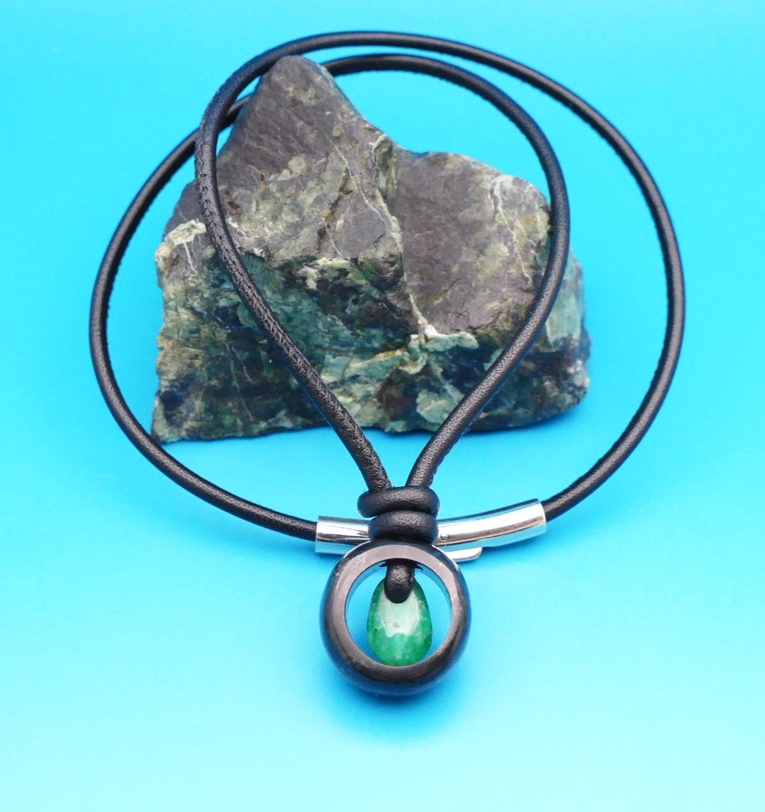 Das Halsband ist aus 3mm Nappaleder gefertigt und hat eine Länge von 45cm. Der Ring besteht aus einem Lyditstein mit 18 mm Durchmesser und einem 12 mm großen Loch.
