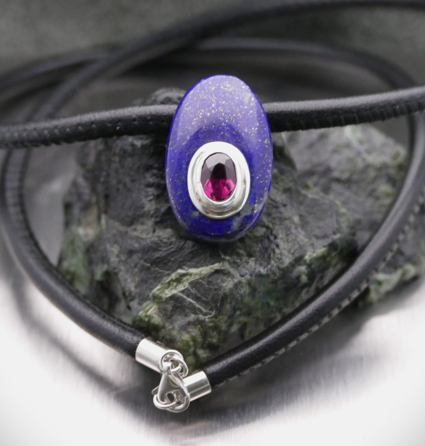 Steine: Lapislazuli (15 x 24 mm) und Rhodolith-Granat (6 x 9 mm), gefasst in 925er Silber.