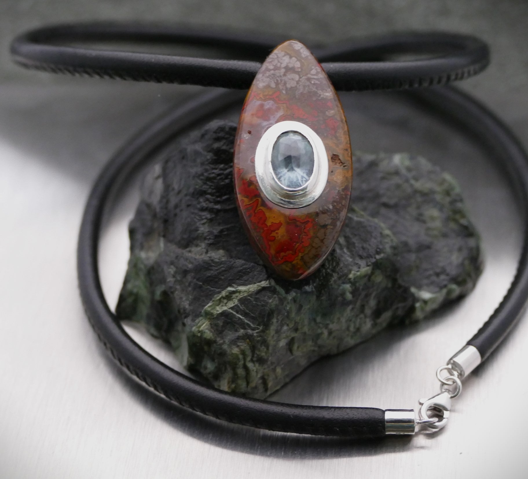 Steine: Feuerachat (18 x 38 mm) und Aquamarin (7 x 10 mm), gefasst in 925er Silber.