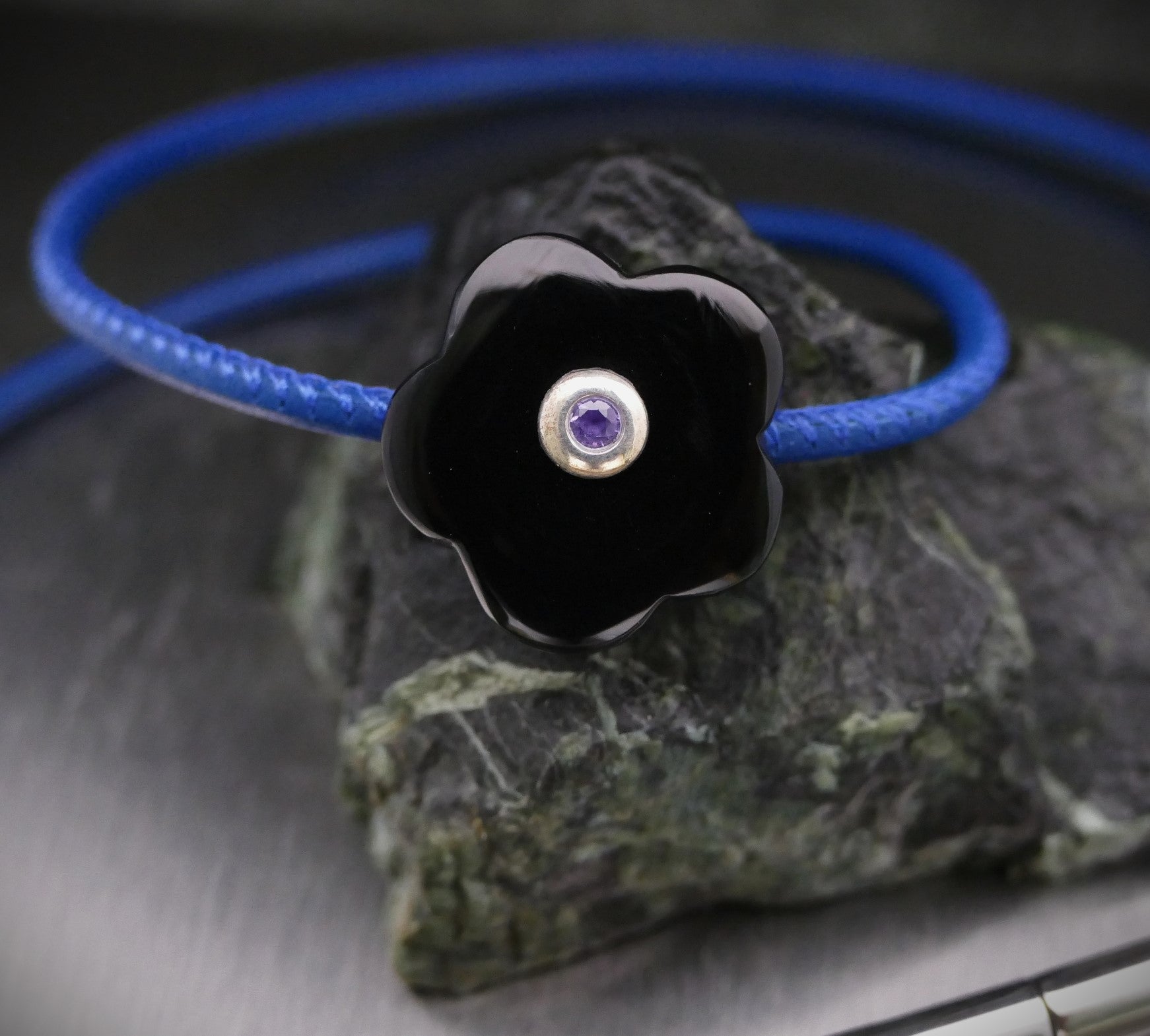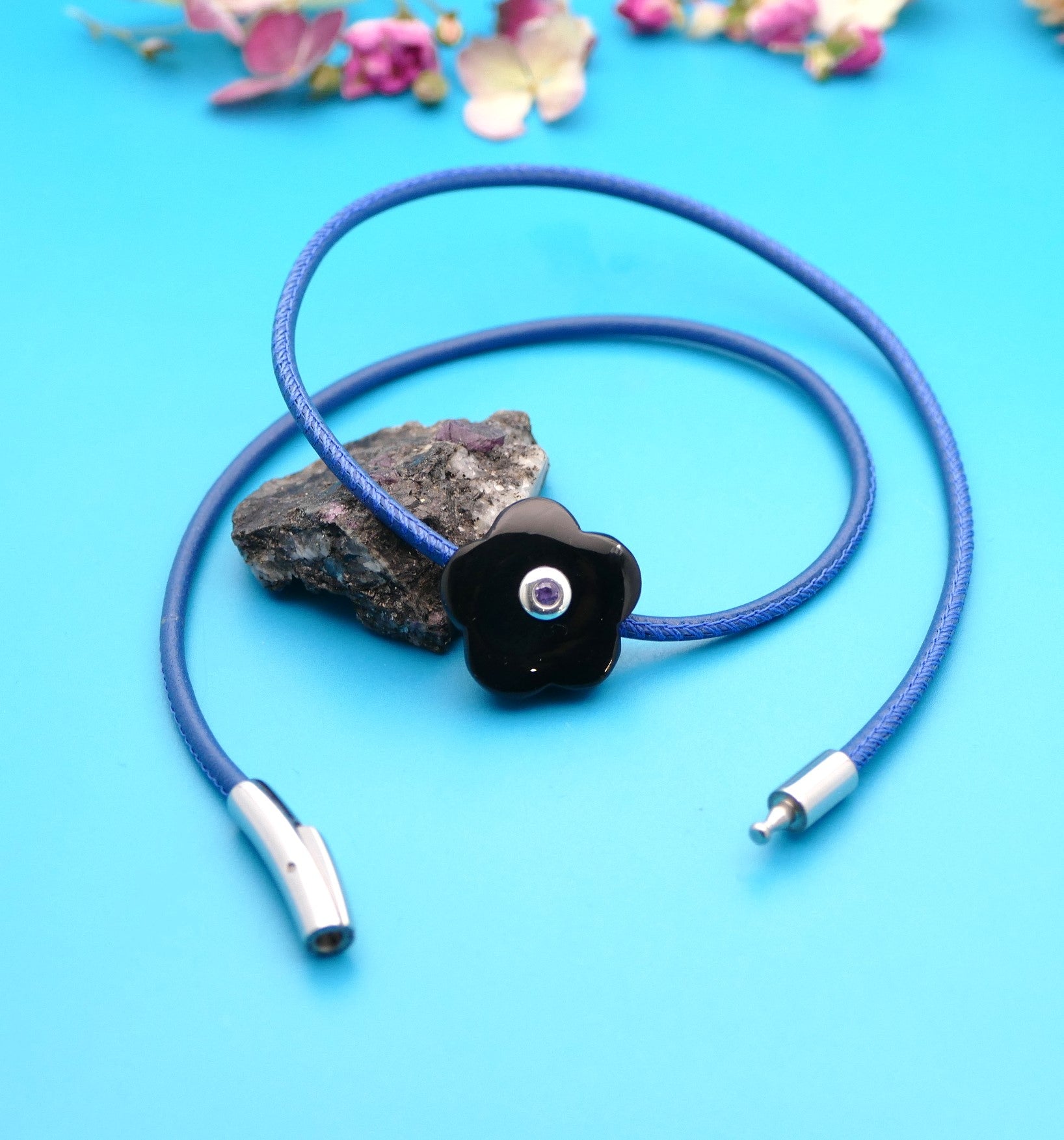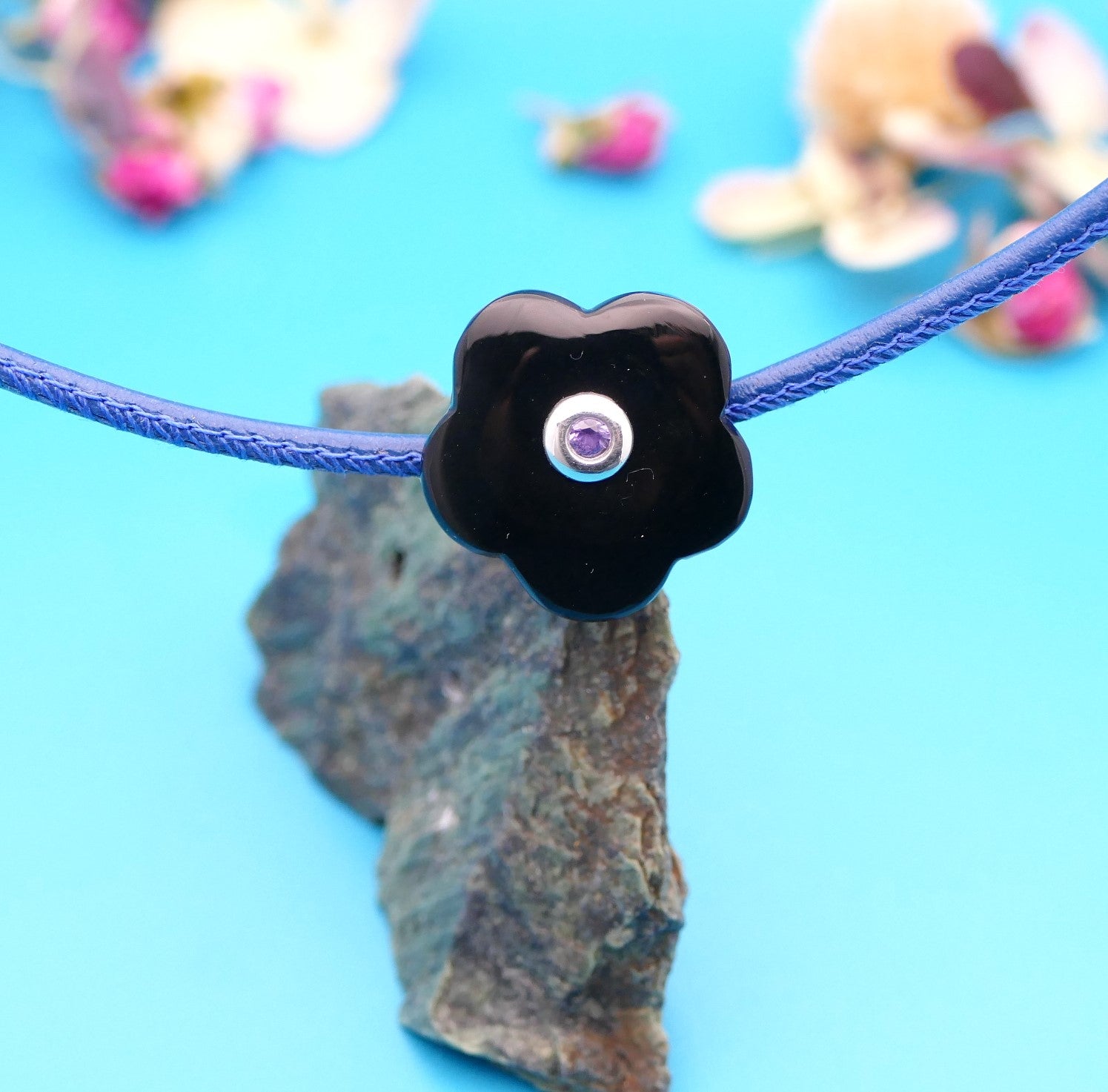 Halskette aus Nappaleder mit einem Durchmesser von 3 mm und einer Länge von 45 cm mit einer Obsidianblume mit einem Durchmesser von 20 mm. In der Mitte ist ein rosafarbener Saphir aus Madagaskar mit einem Durchmesser von 3 mm in 925er Silber eingefasst